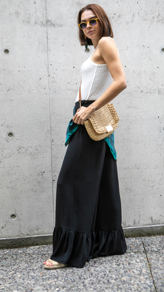 Pantalón confeccionado en crep con cintura elastizada y amarra.