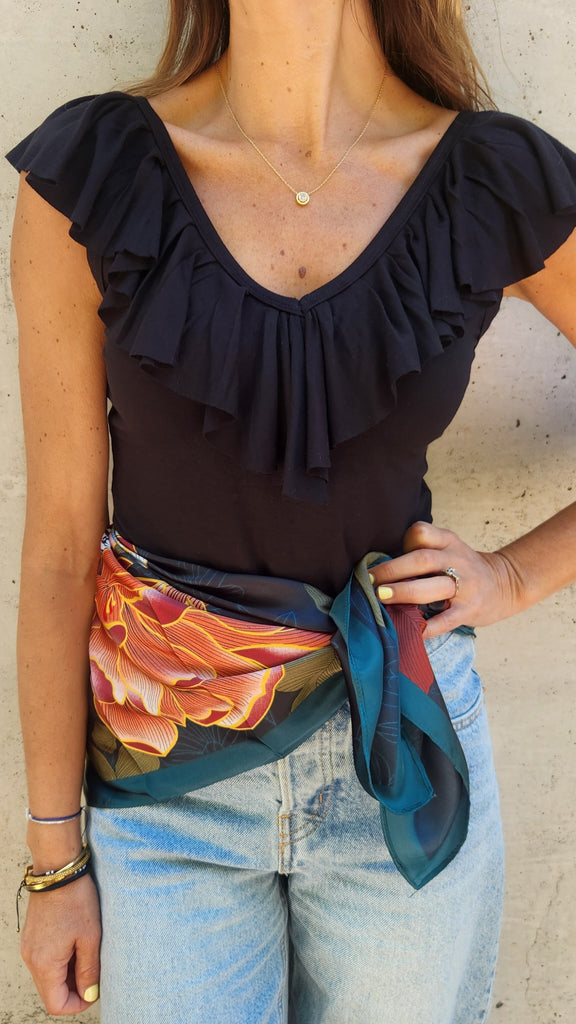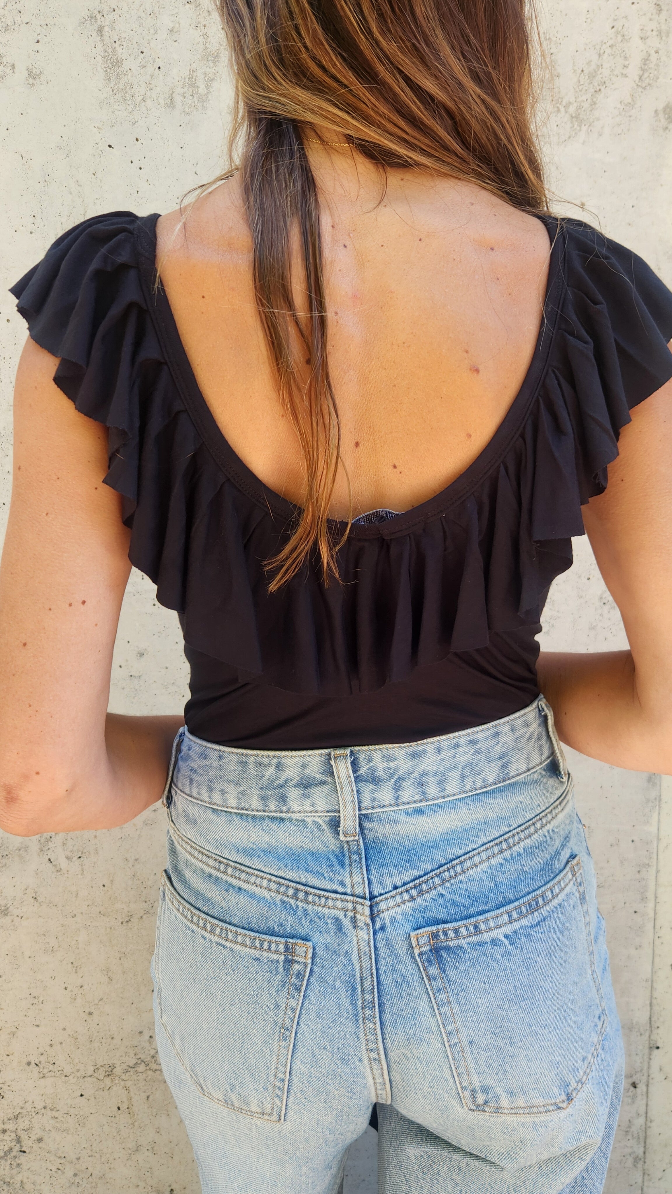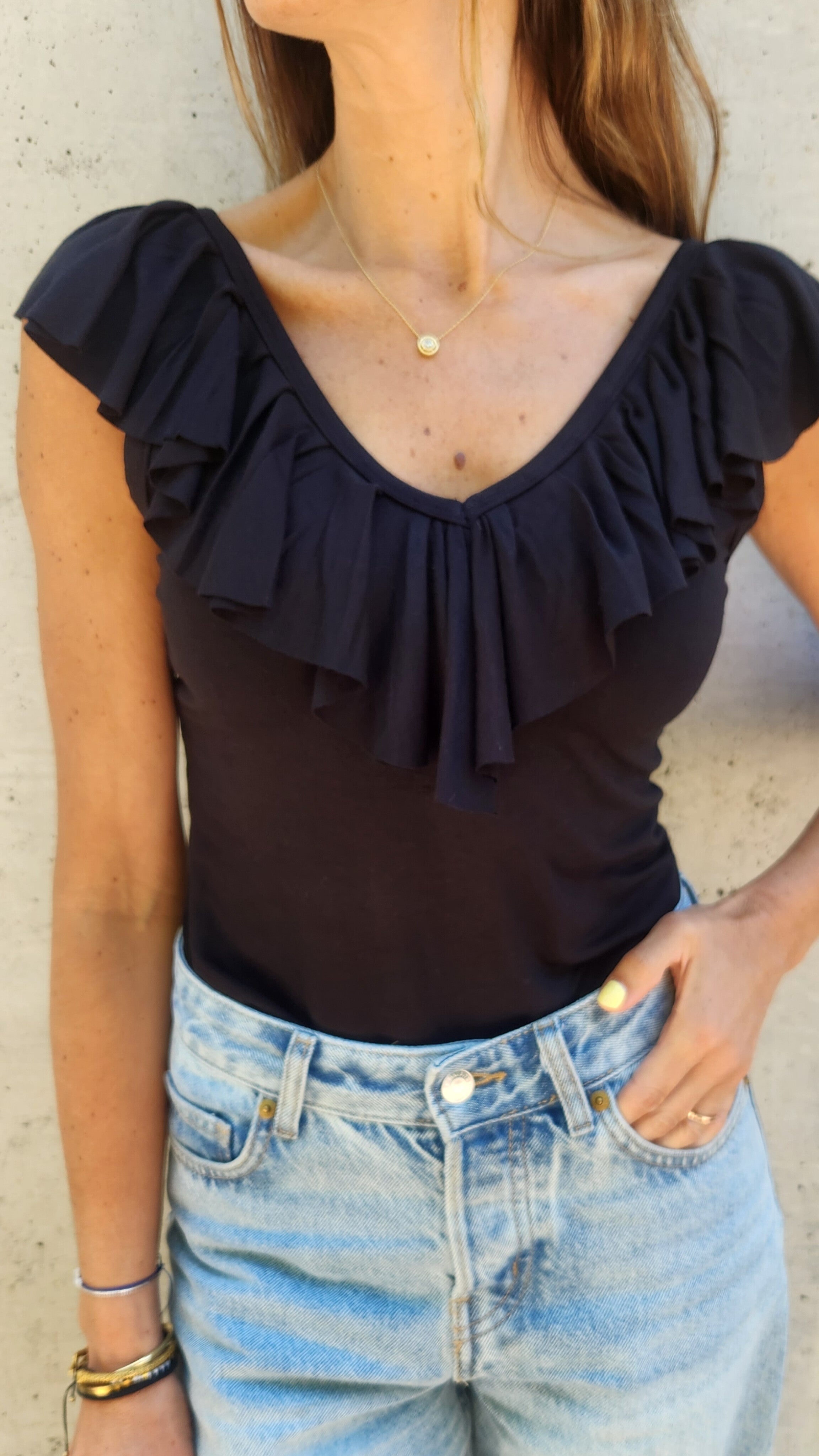 Polera de algodón con escote rebajado y un vuelo por delante y en la espalda.